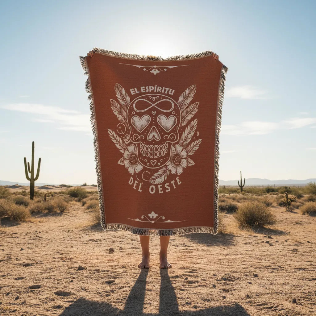 Celebrate the soul of the desert with our El Espíritu del Oeste Heirloom Woven Blanket, a tribute to the Vaquero spirit that shaped the American West. Designed in the timeless Mexican-Western style, this piece features a hand-drawn sugar skull surrounded by desert florals and feathers, symbols of strength, love, and eternal freedom.