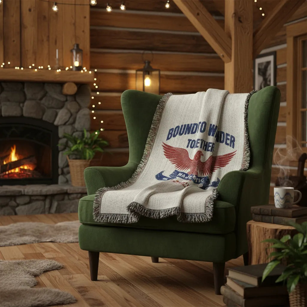 For the ones who roam wild, side-by-side. This heirloom woven blanket celebrates two souls who choose adventure, freedom, and each other, wherever the road leads next. Featuring a bold Americana eagle crest and space to personalize both names, this piece becomes a meaningful keepsake that feels like a story passed down, not just a gift.
